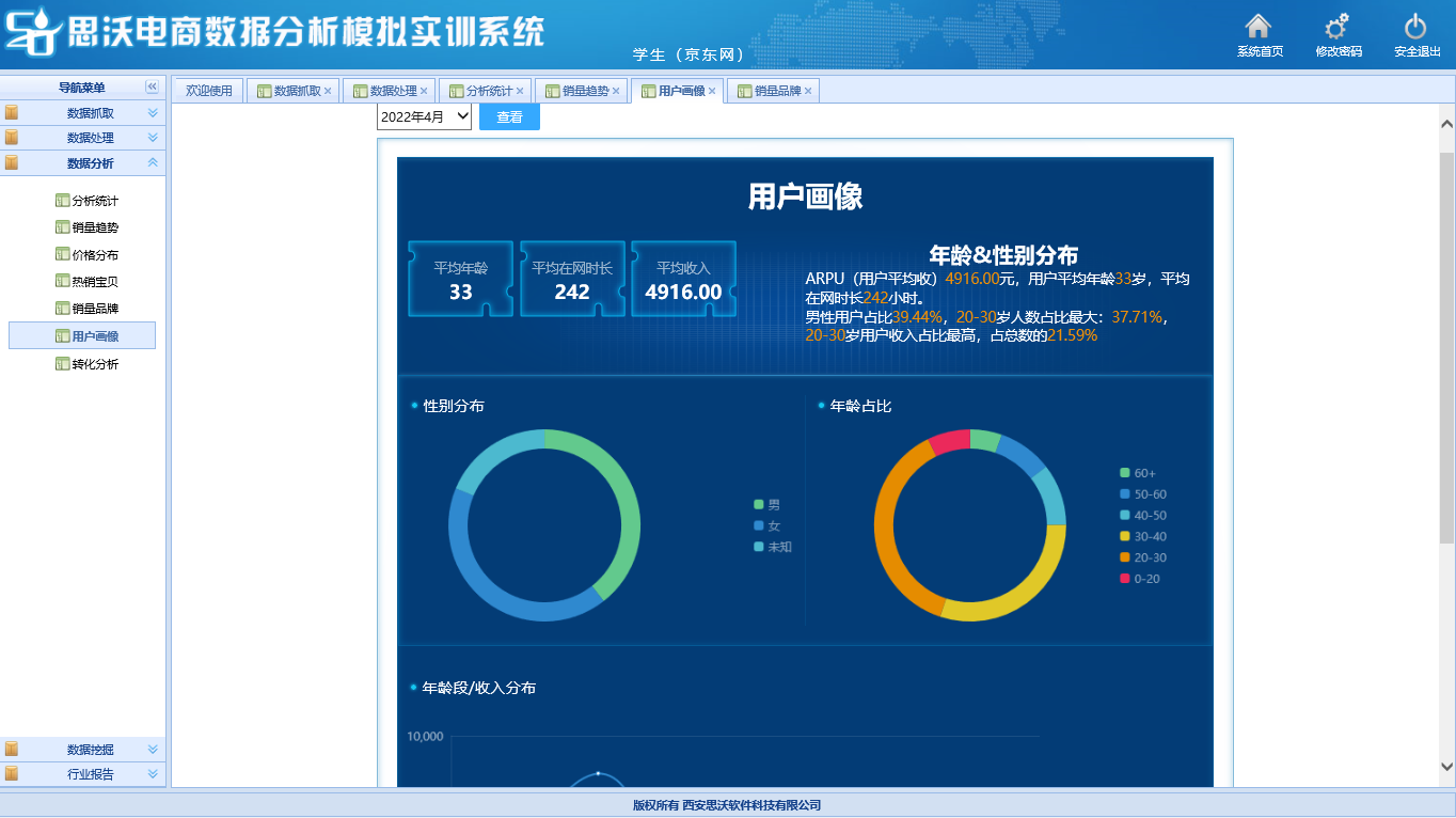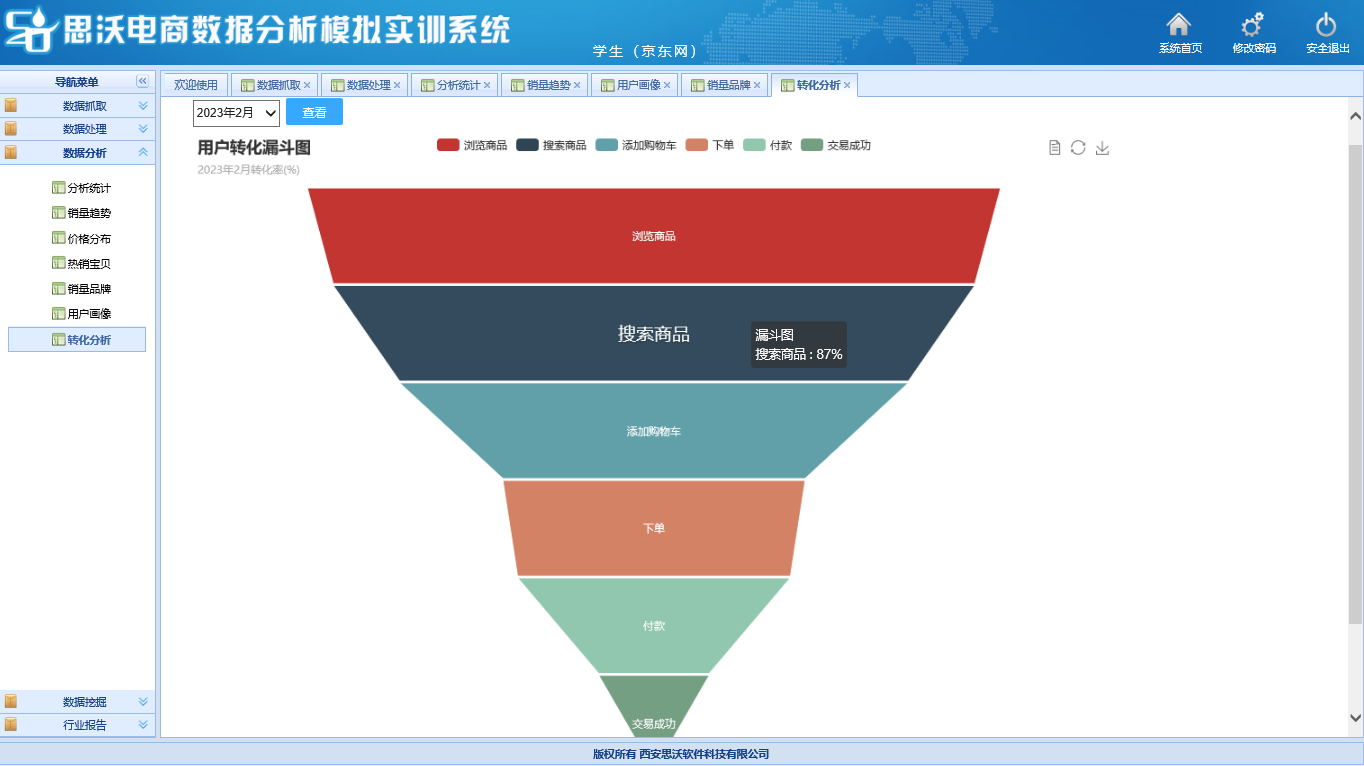 當前大數(shu)(shu)(shu)據(ju)(ju)(ju)和(he)(he)(he)數(shu)(shu)(shu)據(ju)(ju)(ju)化(hua)運(yun)營(ying)的(de)(de)概念早已(yi)深(shen)入人心,數(shu)(shu)(shu)據(ju)(ju)(ju)分(fen)(fen)析(xi)(xi)(xi)已(yi)經成(cheng)(cheng)為(wei)電(dian)商(shang)(shang)(shang)(shang)從業人員不(bu)可或缺的(de)(de)一(yi)項(xiang)技能(neng)。《思沃電(dian)商(shang)(shang)(shang)(shang)數(shu)(shu)(shu)據(ju)(ju)(ju)分(fen)(fen)析(xi)(xi)(xi)模擬實訓(xun)(xun)系(xi)統(tong)》就是(shi)根據(ju)(ju)(ju)當前電(dian)子(zi)(zi)商(shang)(shang)(shang)(shang)務行(xing)業發展(zhan),通過真實模擬電(dian)商(shang)(shang)(shang)(shang)運(yun)營(ying)平臺環境,幫(bang)助學(xue)生掌(zhang)握(wo)電(dian)商(shang)(shang)(shang)(shang)數(shu)(shu)(shu)據(ju)(ju)(ju)分(fen)(fen)析(xi)(xi)(xi)技能(neng)的(de)(de)教學(xue)平臺軟(ruan)件(jian)(jian)。隨(sui)著市場(chang)(chang)規模的(de)(de)普遍增(zeng)加和(he)(he)(he)業務規模的(de)(de)快速增(zeng)長,電(dian)商(shang)(shang)(shang)(shang)業務流程(cheng)開(kai)始變(bian)得復雜(za), 涉及(ji)的(de)(de)交易數(shu)(shu)(shu)據(ju)(ju)(ju)量(liang)(liang)將(jiang)繼續增(zeng)加。為(wei)了在激烈的(de)(de)市場(chang)(chang)競(jing)(jing)(jing)爭(zheng)中脫穎而出,許多電(dian)商(shang)(shang)(shang)(shang)公司都會設立專門的(de)(de)崗(gang)位和(he)(he)(he)人員,及(ji)時了解廣告、產(chan)品(pin)價格和(he)(he)(he)銷售數(shu)(shu)(shu)據(ju)(ju)(ju),并根據(ju)(ju)(ju)競(jing)(jing)(jing)爭(zheng)產(chan)品(pin) 的(de)(de)產(chan)品(pin)和(he)(he)(he)營(ying)銷策略進(jin)行(xing)調整。隨(sui)著電(dian)商(shang)(shang)(shang)(shang)領域穩步增(zeng)長,競(jing)(jing)(jing)爭(zheng)日益(yi)激烈,渠道精細化(hua)運(yun)營(ying)已(yi)然成(cheng)(cheng)為(wei)品(pin)牌突圍(wei)的(de)(de)重中之重。 數(shu)(shu)(shu)據(ju)(ju)(ju)(和(he)(he)(he)數(shu)(shu)(shu)據(ju)(ju)(ju)分(fen)(fen)析(xi)(xi)(xi))對(dui)電(dian)商(shang)(shang)(shang)(shang)至關重要(yao),通過海量(liang)(liang)數(shu)(shu)(shu)據(ju)(ju)(ju),店鋪(pu)運(yun)營(ying)人員可以了解客戶(hu)的(de)(de)行(xing)為(wei)和(he)(he)(he)偏好,也可以洞察同行(xing)業競(jing)(jing)(jing)爭(zheng)對(dui)手的(de)(de)方向和(he)(he)(he)動態,這(zhe)就是(shi)了解自(zi)己、了解競(jing)(jing)(jing)爭(zheng)對(dui)手。 《思沃電(dian)商(shang)(shang)(shang)(shang)數(shu)(shu)(shu)據(ju)(ju)(ju)分(fen)(fen)析(xi)(xi)(xi)模擬實訓(xun)(xun)系(xi)統(tong)》高度模擬京(jing)(jing)東(dong)網(wang),真實獲取海量(liang)(liang)京(jing)(jing)東(dong)真實數(shu)(shu)(shu)據(ju)(ju)(ju),該教學(xue)軟(ruan)件(jian)(jian)系(xi)統(tong)的(de)(de)從京(jing)(jing)東(dong)的(de)(de)各行(xing)業數(shu)(shu)(shu)據(ju)(ju)(ju)分(fen)(fen)析(xi)(xi)(xi)入手,系(xi)統(tong)展(zhan)示在電(dian)子(zi)(zi)商(shang)(shang)(shang)(shang)務環境下(xia)進(jin)行(xing)運(yun)營(ying)數(shu)(shu)(shu)據(ju)(ju)(ju)分(fen)(fen)析(xi)(xi)(xi)的(de)(de)各種思路和(he)(he)(he)方法。 能(neng)讓學(xue)生快速學(xue)會如何(he)做電(dian)商(shang)(shang)(shang)(shang)數(shu)(shu)(shu)據(ju)(ju)(ju)分(fen)(fen)析(xi)(xi)(xi),并能(neng)利用數(shu)(shu)(shu)據(ju)(ju)(ju)分(fen)(fen)析(xi)(xi)(xi)結果指導網(wang)店經營(ying)。