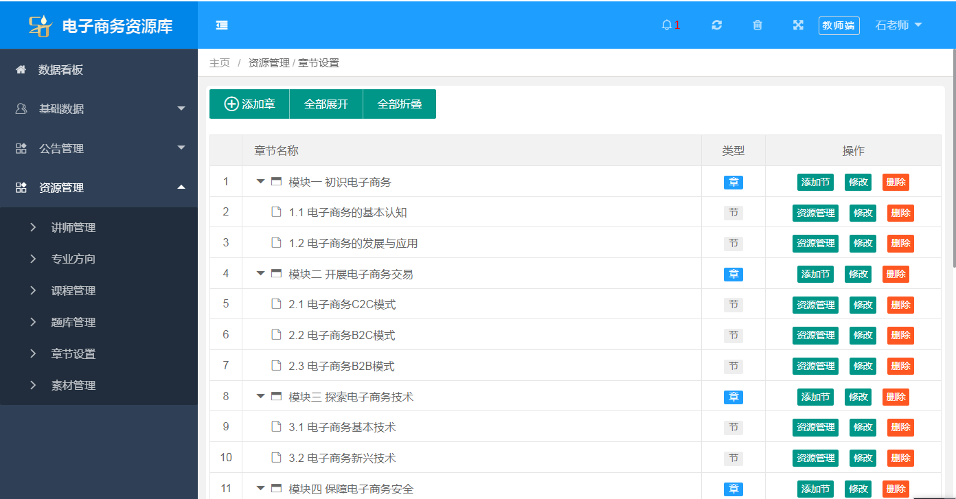 教師端(duan)的基(ji)礎數(shu)(shu)據包括數(shu)(shu)據看板,基(ji)礎數(shu)(shu)據,公告管理,資源管理。數(shu)(shu)據統(tong)(tong)計(ji)(ji)包括班級統(tong)(tong)計(ji)(ji),學(xue)生統(tong)(tong)計(ji)(ji),專業方向,課(ke)程統(tong)(tong)計(ji)(ji),講師統(tong)(tong)計(ji)(ji),素材(cai)統(tong)(tong)計(ji)(ji),報表統(tong)(tong)計(ji)(ji)等。