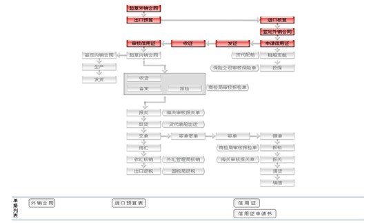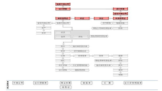 業務流(liu)程:CIF+L/C,CIF+/D/A,CIF+D/P,CIF+T/T Before shipment CIF+T/T After shipment FOB+L/C,FOB+/D/A,FOB+D/P,FOB+T/T Before shipment FOB+T/T After shipment CFR+L/C,CFR+/D/A,CFR+D/P,CFR+T/T Before shipment CFR+T/T After shipment 業務流(liu)程:在這里填(tian)寫和查看所需要的(de)單(dan)據(ju)(ju)。直(zhi)接可在流(liu)程圖中表(biao)現。查看的(de)單(dan)據(ju)(ju)分填(tian)寫的(de)單(dan)據(ju)(ju)和收到的(de)單(dan)據(ju)(ju)