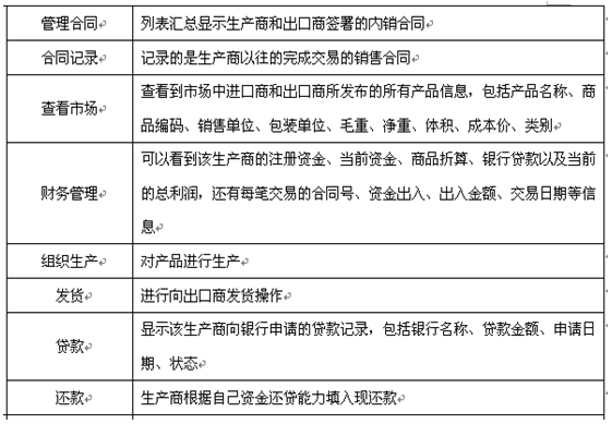 教師為參加實習(xi)的學(xue)生(sheng)(sheng)分(fen)配角(jiao)色,設定(ding)實習(xi)評(ping)分(fen)標(biao)準、實時監控學(xue)生(sheng)(sheng)的操作(zuo),并且對(dui)(dui)于模擬貿易(yi)中(zhong)發(fa)(fa)生(sheng)(sheng)的糾(jiu)紛(fen)進(jin)行(xing)仲(zhong)裁,最(zui)終利用(yong)評(ping)分(fen)系統對(dui)(dui)學(xue)生(sheng)(sheng)的實習(xi)成果給予評(ping)定(ding),教師通(tong)過在(zai)網站發(fa)(fa)布新聞(wen)、調整商品成本和(he)價格、調整匯率(lv)、業務費(fei)用(yong)、海運費(fei)、保險(xian)費(fei)率(lv)及突發(fa)(fa)事件的發(fa)(fa)生(sheng)(sheng)概率(lv)等(deng)方(fang)式對(dui)(dui)國際(ji)貿易(yi)環境實施(shi)宏觀調控,讓學(xue)生(sheng)(sheng)在(zai)實習(xi)中(zhong)充分(fen)發(fa)(fa)揮主觀能動性