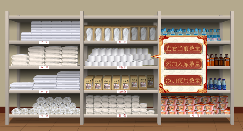 學生模(mo)擬工(gong)作(zuo)人員(yuan)通過動(dong)畫(hua)場景(jing)互(hu)動(dong)對布(bu)草間進行(xing)管理操作(zuo)。并可查看床(chuang)單、被罩、枕(zhen)套(tao)、浴(yu)巾、毛巾、洗(xi)漱包、洗(xi)發(fa)水等消耗物品的庫(ku)存數量,并判斷是否(fou)補充。