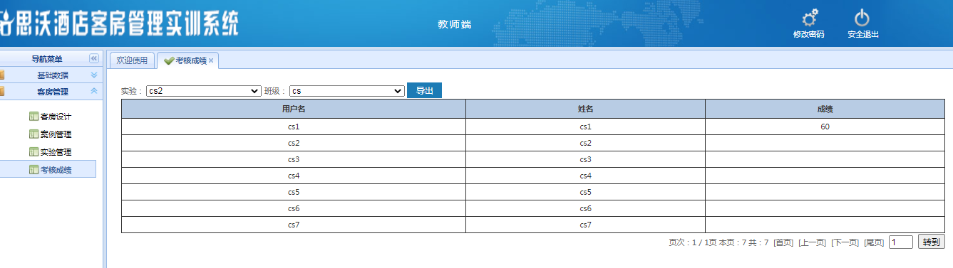 教師登陸界面:基礎數據、客房管理,在線考試,資源拓展每個大模塊下分別(bie)有(you)相應(ying)的子模塊。