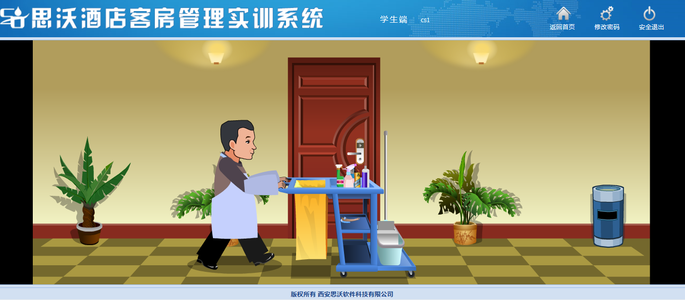 思(si)沃酒店客(ke)房(fang)(fang)管理(li)(li)模擬(ni)實訓(xun)(xun)系統(tong)以flash動畫模擬(ni)酒店情景,學生進(jin)入進(jin)行模擬(ni)客(ke)房(fang)(fang)管理(li)(li)日(ri)常事務處理(li)(li),包(bao)括客(ke)房(fang)(fang)設(she)計、引(yin)領入住、客(ke)房(fang)(fang)查(cha)房(fang)(fang)、客(ke)房(fang)(fang)整理(li)(li)、布草(cao)間等類(lei)型實訓(xun)(xun)。