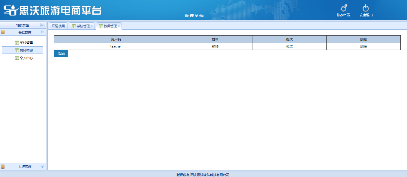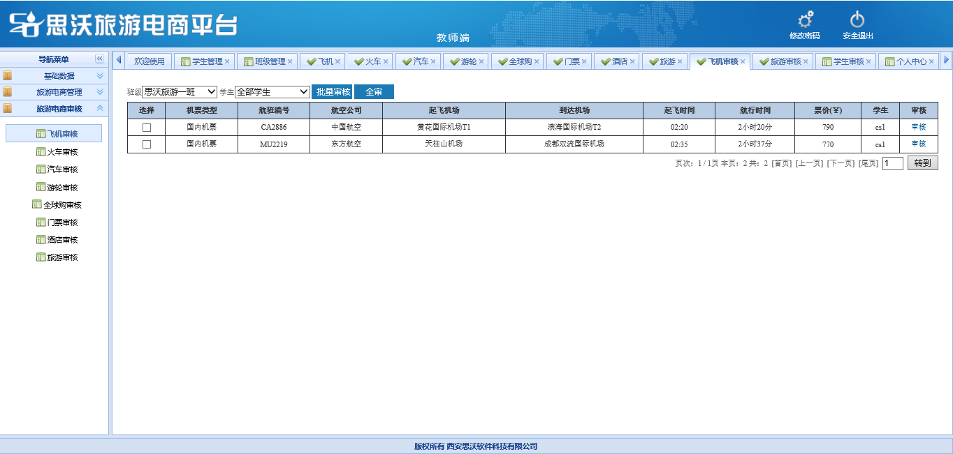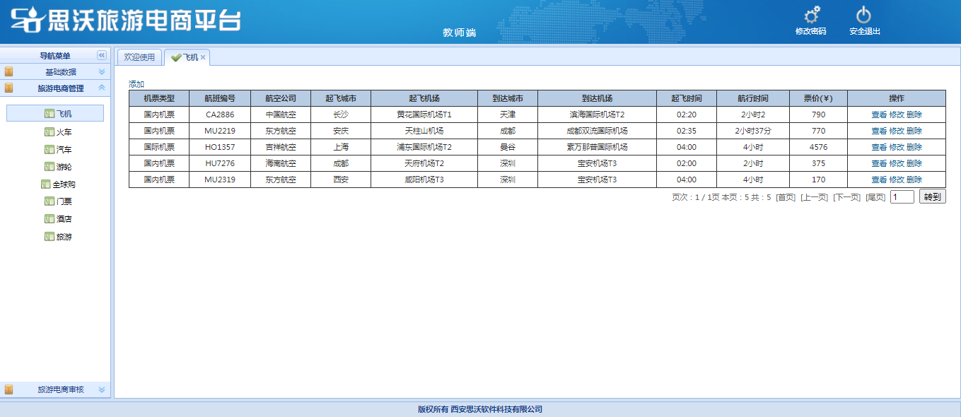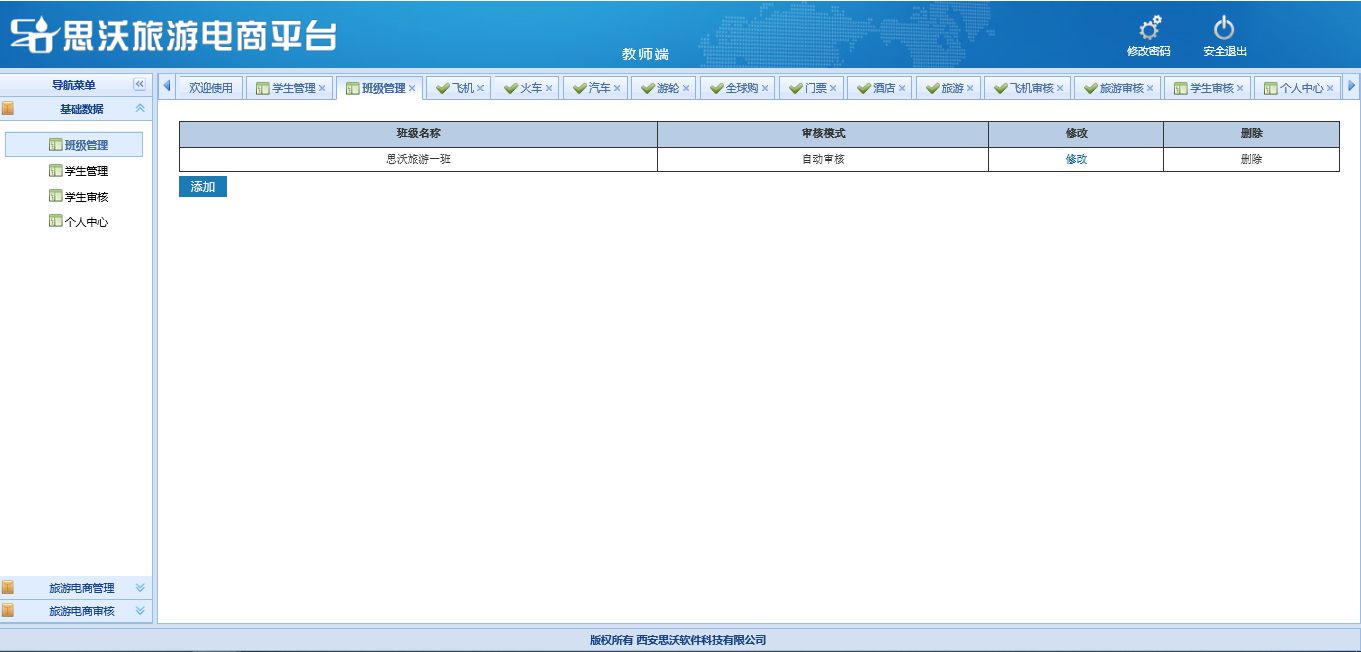 教師端包括:基礎(chu)數據(班級管(guan)理、學生管(guan)理、學生審(shen)核(he)、個人信息(xi));旅游(you)(you)電商(shang)管(guan)理(對學生發(fa)布已(yi)審(shen)核(he)的飛機、火車(che)、汽(qi)車(che)、游(you)(you)輪(lun)、全球購、門票(piao)、酒店、旅游(you)(you)產品信息(xi)進(jin)行(xing)(xing)管(guan)理);旅游(you)(you)電商(shang)審(shen)核(he)(對學生發(fa)布的飛機、火車(che)、汽(qi)車(che)、游(you)(you)輪(lun)、全球購、門票(piao)、酒店、旅游(you)(you)產品信息(xi)進(jin)行(xing)(xing)進(jin)行(xing)(xing)審(shen)核(he))。